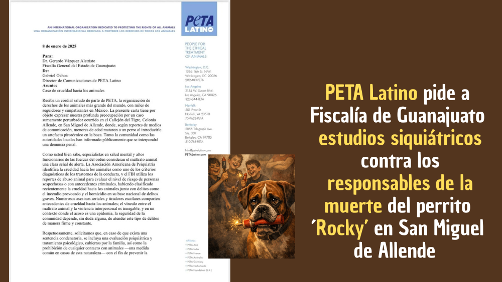 Según compartió el organismo en sus redes sociales, la organización PETA Latino no se anda con cuentos: en una carta dirigida al fiscal Gerardo Vázquez Alatriste, exige que si se confirma la responsabilidad de los implicados, se les ordene una evaluación psiquiátrica y tratamiento psicológico, además de prohibirles tener contacto con animales, con el fin de detener la repetición de hechos que califican como señal de alarma en conducta humana.