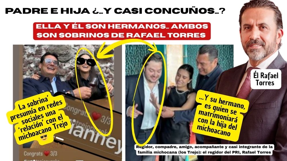 Shora buscará de nuevo conquistarte con lo que ya te habia quitado, pues dice que con eso, es suficiente para que le regreses el “amorssss”, aunque para eso, en el gobierno del michoacano ya hay un proveedor de amorsssss oficial: el regidor, compadre, amigo, acompañante, cómplice, prestanombres y ahora YA DE LA FAMILIA ☺️, Rafael Torres Sánchez, un hombre que eternamente ha estado al servicio de Trejo y ahora su amistad se fortalece con la unión y multiplicación de la familia.