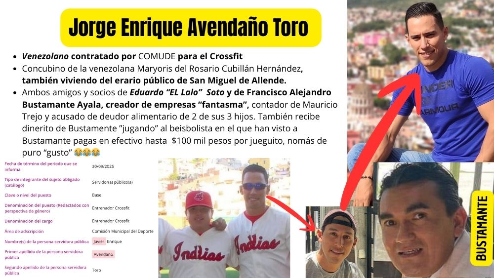 Mientras San Miguel se cae a pedazos en servicios, seguridad y obra pública, el dinero se evapora en el palacio dorado del michoacano y sus leales, que no solo se conforma con los fuereños locales, sino también mantener con dinero del pueblo a un par de vividores, perdón, ‘entrenadores” venezolanos que llegaron al terruño traídos por el Rey Midas al revés (porque todo lo que toca lo hace 💩💩💩💩💩💩) Eduardo “El Lalo” Soto para entrenar el Crossfit en la COMUDE, sus nombres: el venezolano Jorge Enrique Avendaño Toro quien se trajo a vivir también del pueblo sanmiguelense a su concubina, la tambien venezolana Maryoris del Rosario Cubillán Hernández.