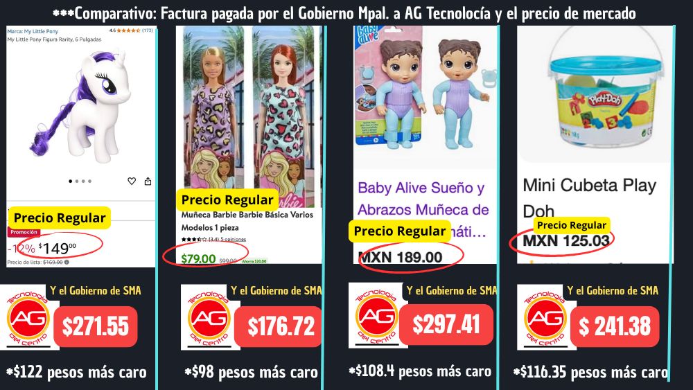 Y fue con ella misma que las facturas a sobreprecio se convirtieron en una constante de esta mujer, aunque no esté en su oficina, pues primero UTILIZÓ A LOS NIÑOS, para inflar los juguetes que regalaron el 30 de abril, el día del niño y donde, con ayuda de un proveedor de Tablets y computadoras, ahora le extendió el rango y puede vender juguetes, bolsas y otras cositas que la señora Oficial necesite mercar, claro, con un precio superior al del mercado, pues simulando una invitación-concurso, pues se queda con la vieja confiable: A.G. Tecnología, S.A. de C.V.