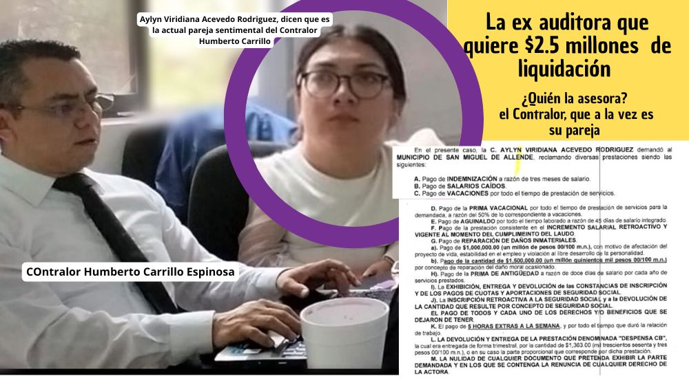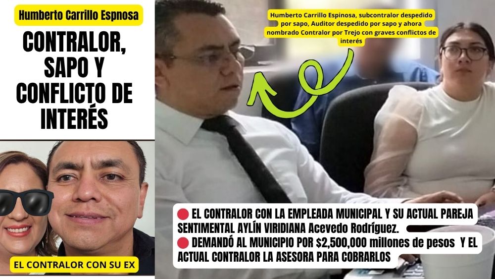 Pues resulta que esta señora de nombre Aylyn Viridiana Acevedo, que tiene una estrecha relación con el Contralor, está demandando al municipio por $2.5 millones de pesos luego de ser despedida y no, el conflicto no es que pelee por sus derechos, sino que quien está asesorándola para que con re esa millonada es nada menos que el que debía cuidar los recursos y movimientos: El contralor Humberto Carrillo Espinosa, el fuereño que en octubre del 2024 fue despedido por “sapo” por chismoso, por traidor y ahora Trejolandia lo cobija por su corrupción.