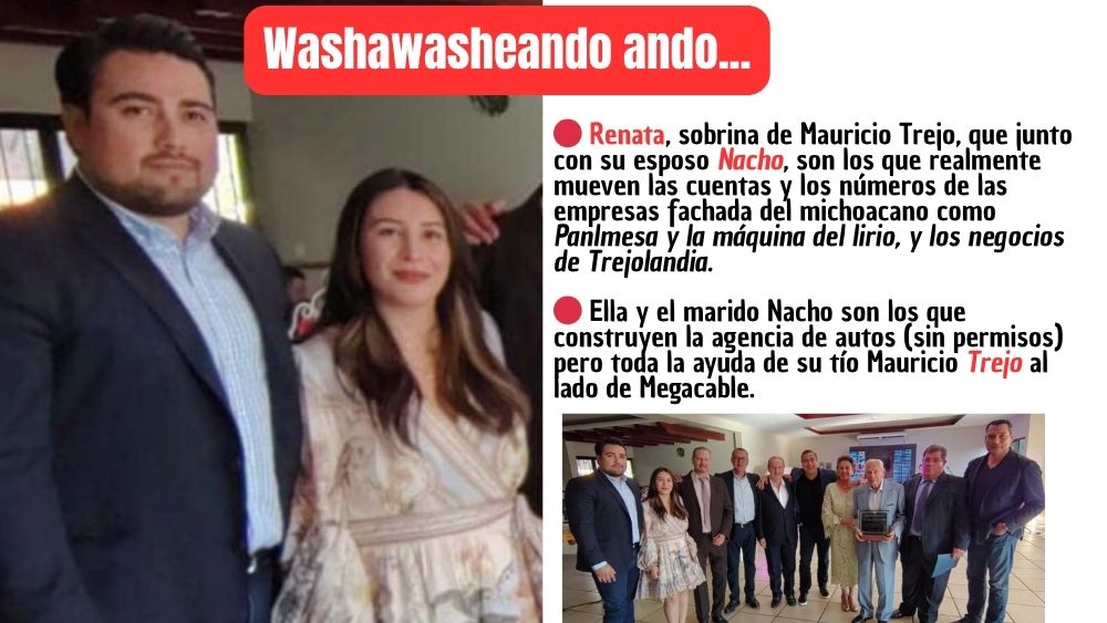 - Y la Agencia de autos chinos que abrirá la sobrina consentida, Renata Trejo, la representante legal en el edificio del antro llamado a Sala de Despecho (QUE ES DE TREJO), donde está el República, (QUE ES DE TREJO) y dicen que hasta del negocio de Chavorrucos (QUE ES DE TREJO) en Hernandez Macías, pues en realidad quien está detrás de todos los tejes manejes, es el esposo de Renata Trejo, un hombre llamado Ignacio, llamado por los cuates como “Nachito”, el mago financiero que mueve el dinero de las empresas fantasma, ficticias, mentirosas, falsas, chuecas y tramposas (sí, así, con todas sus letras).