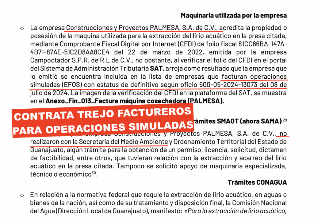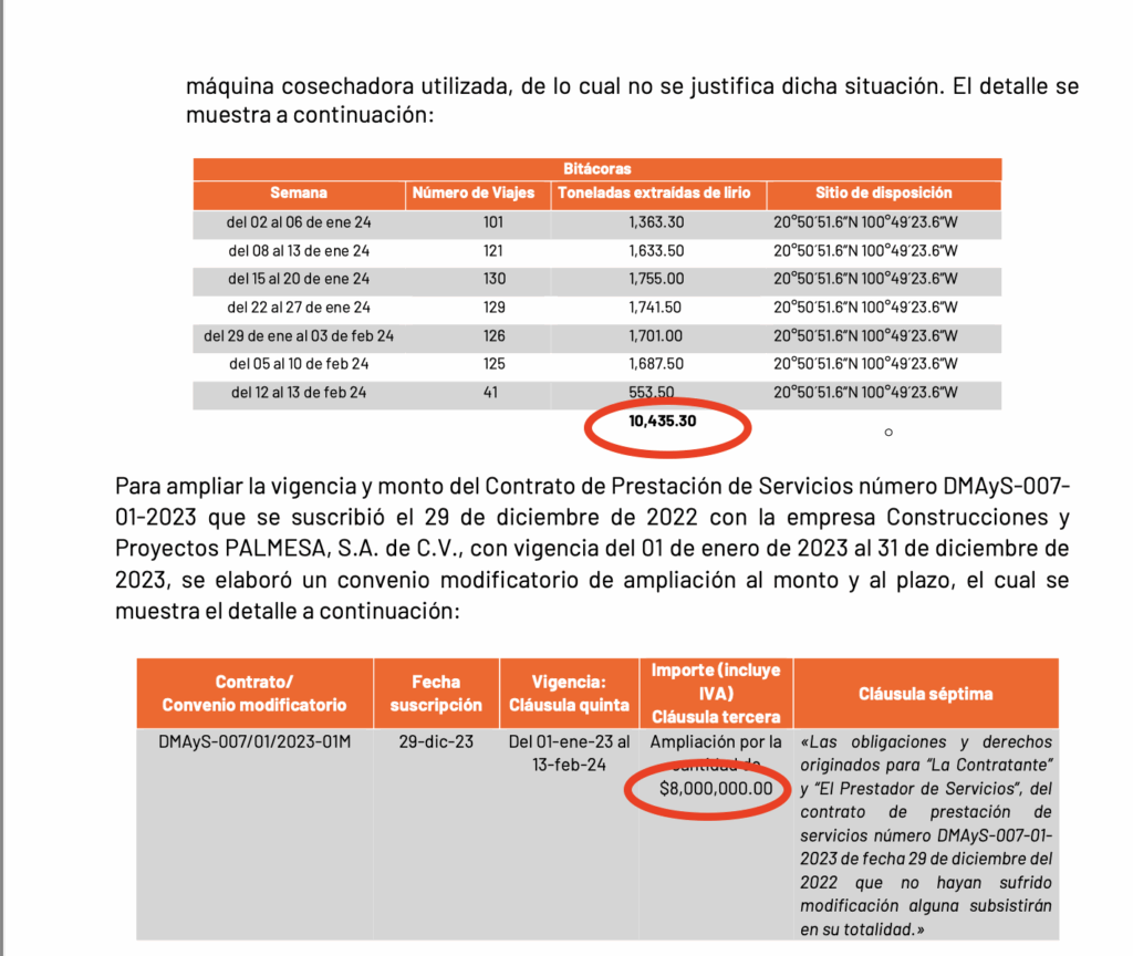 Según la auditoría, esa que ahora quieren desaparecer y el michoacano lo negó a pesar de saber que existia (hazme el re Ching… favor), el gobierno de Trejo firmó un “servicio integral” de acarreo y extracción de lirio. Lo curioso es que nadie vio las máquinas, nadie vio los camiones, nadie vio el lirio…