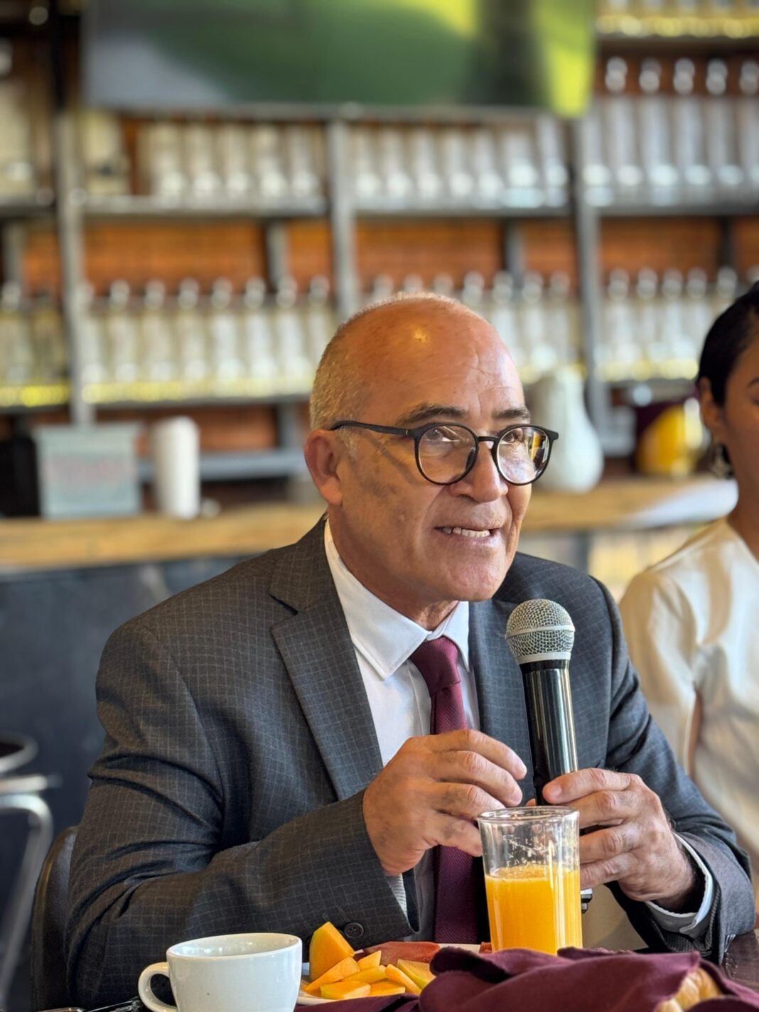 Aquí Ernesto Berra, el que dejaron de Ecología, ataviado en un blazer brillante, solapa negra y pecho al viento, con el choque del 21 de septiembre del 2024, en la Calzada La Estación.