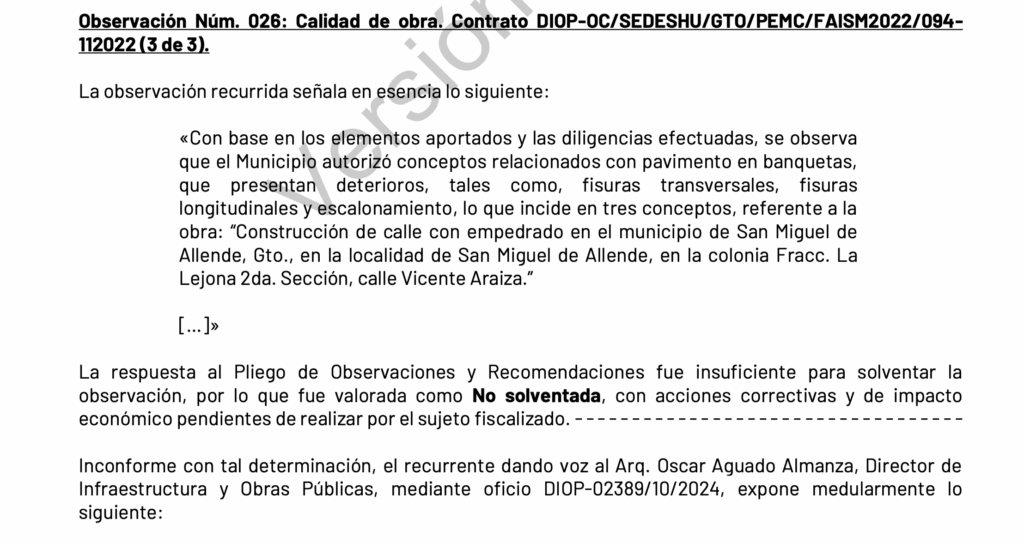 La observación 26 se refiere nada más y nada menos que a la ya famosa y multicoloreada obra de la calle Vicente Araiza en la colonia La Lejona 2. Sí, esa que fue presumida como símbolo de inclusión, progreso, desarrollo y vaya usted a saber cuánta cosa dijeron en el discurso inaugural.