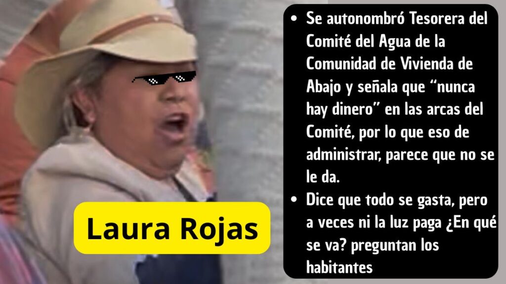De acuerdo con las denuncias ciudadanas, se trata de Laura Rojas, tesorera del comité del agua, quien “jura y promete” ejercer el cargo con” honradez”. Sin embargo, los inconformes aseguran que durante más de una década ha concentrado el control de las cuotas y multas, cobrando sumas “jugosas” por cada toma nueva, además de sanciones excesivas si alguien se atrasa en el pago.