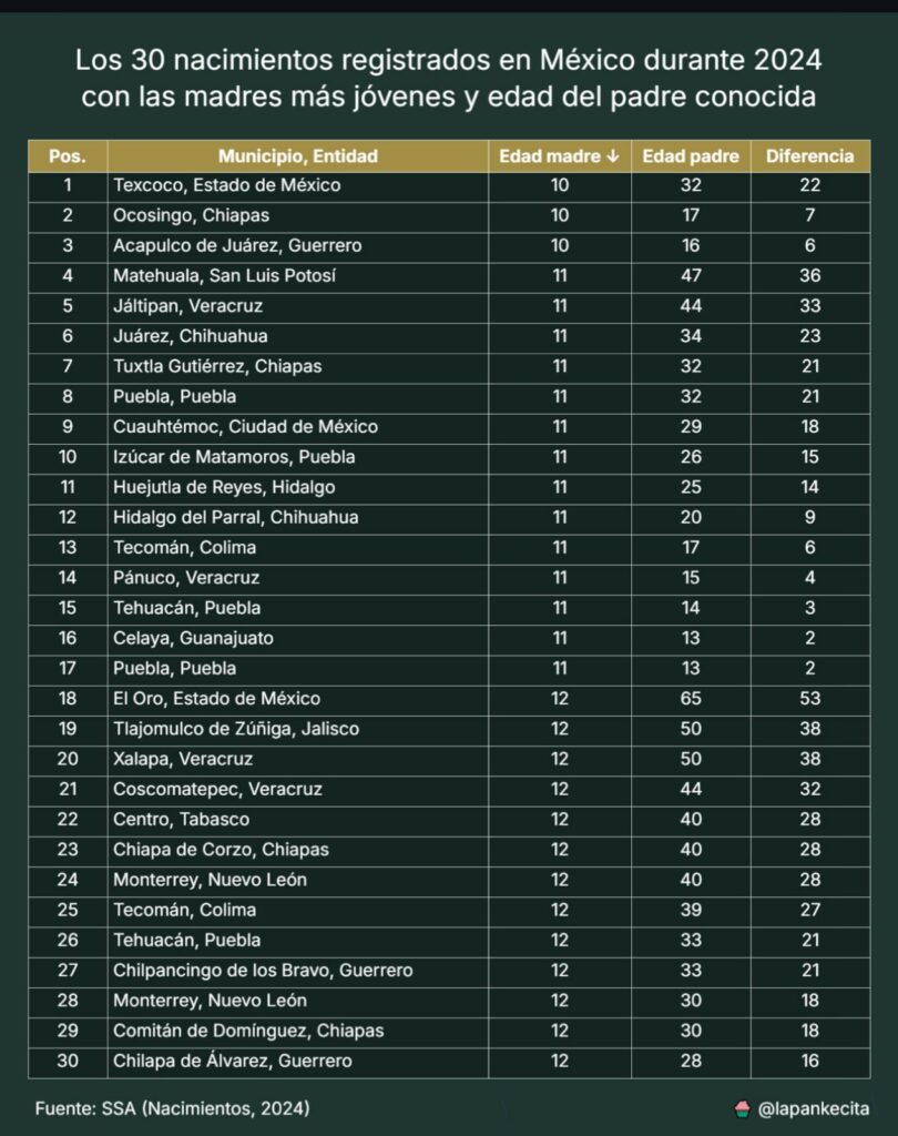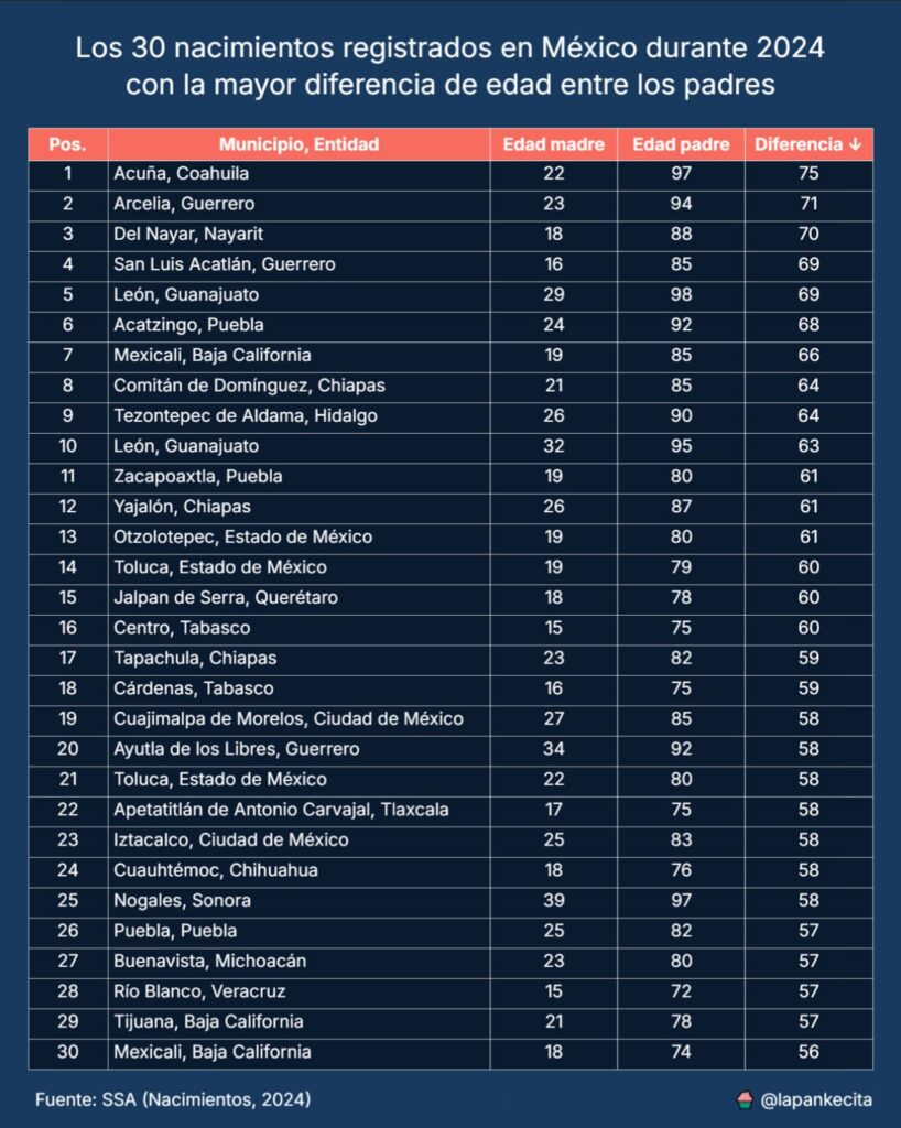 Y si eso ya suena indignante, hay otra lista que también duele: la de la edad de los padres. Hay casos registrados en los que la madre tiene 18 años… y el papá 88. Así como lo lees.