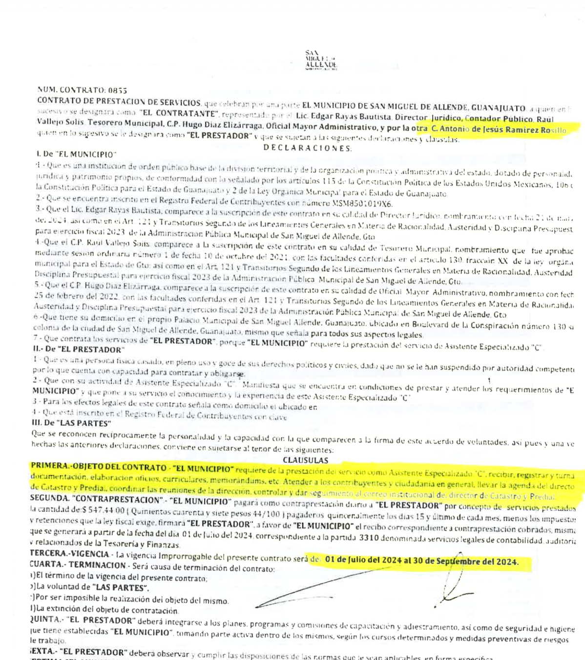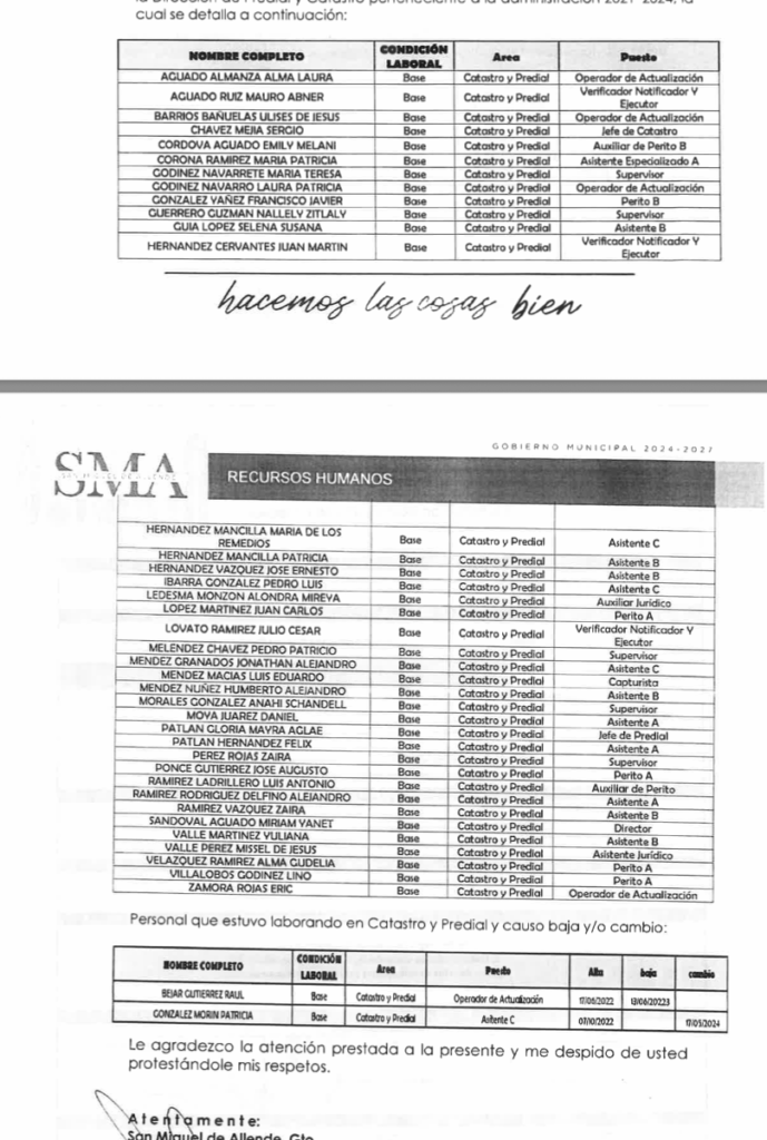 SAN MIGUEL DE ALLENDE.- Con documentos en mano -acta de matrimonio, contrato de honorarios y firmas oficiales-, un ex trabajador de Catastro revela un presunto caso de nepotismo y simulación laboral que involucra a la hoy síndica del Cabildo. Entre los firmantes del contrato están el tesorero Raúl Vallejo Solís, el ex oficial mayor Hugo Elizarrarás y la secretaria del Ayuntamiento, Laura González.
