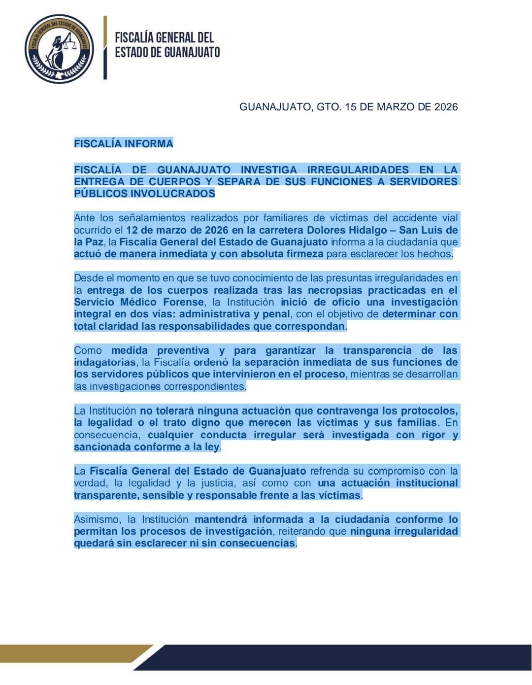GUANAJUATO.- Luego del escándalo que provocó la entrega equivocada de cuerpos a familias de víctimas de un accidente en Dolores Hidalgo, la Fiscalía General del Estado de Guanajuato informó que varios funcionarios fueron separados de sus cargos, mientras se realizan las investigaciones correspondientes.