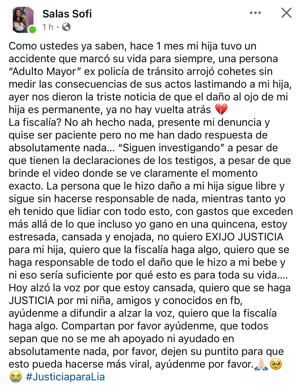 “Ayer nos dieron la noticia más desgarradora: el daño al ojo de mi hija es permanente, no hay vuelta atrás. Mi niña se quedó sin ojos por la irresponsabilidad de un adulto”, expresó la madre en un mensaje difundido en redes sociales.