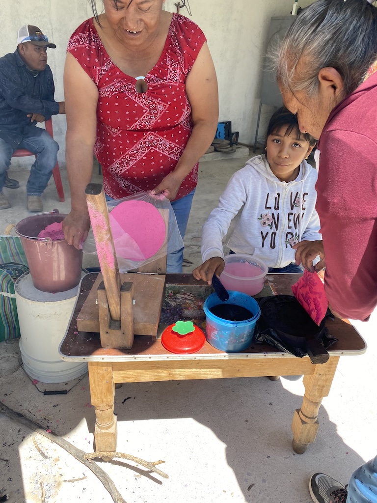 Las tortillas ceremoniales, hechas con maíz puro y teñidas con muicle, eran cuidadosamente marcadas con sellos que cuentan historias antiguas: símbolos de herencia, de lucha y de espiritualidad.