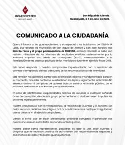 GUANAJUATO.- Con un firme llamado a la rendición de cuentas y a la vigilancia en el uso de los recursos públicos, el diputado local Ricardo Ferro, junto con el grupo parlamentario de Morena, anunció que se encuentra realizando una revisión minuciosa de los informes emitidos por la Auditoría Superior del Estado de Guanajuato (ASEG), correspondientes al ejercicio fiscal 2023 en diversos municipios, incluyendo San Miguel de Allende y San José Iturbide.
