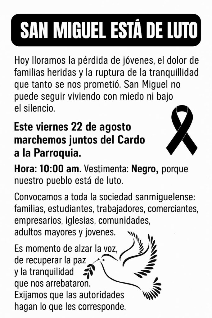 La indignación es generalizada: San Miguel no puede seguir viviendo con miedo ni bajo el silencio. Por eso, la sociedad sanmiguelense convoca a una marcha ciudadana bajo el lema “San Miguel está de luto”, una expresión de dolor, unidad y exigencia.